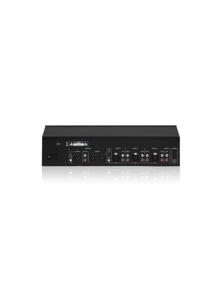 Outputs MAIN OUT (XLR3 w/ gain) + Stereo AUX OUT (RCA w/ gain) + Mono SUB OUT (XLR3 w/ selectable LPF) + Headphones (mini-jack w/ gain)