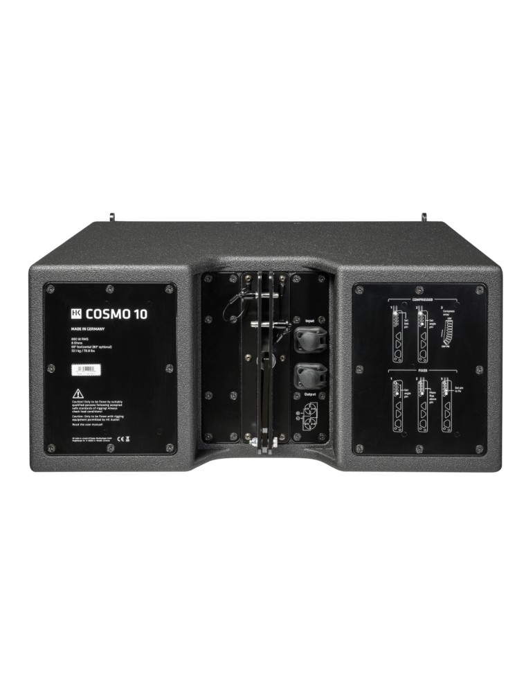 The COSMO C 10 has two 10″ neodymium speakers with a horizontal dispersion of 60°. It is therefore ideally suited as a full-range line array for large events with required ranges of 80 meters and more. The narrow horizontal dispersion allows a large throw range with targeted sound distribution. The asymmetrical sound distribution of the C 10 mid/high unit can be modularly adjusted by pairing it with C 6 and C 8 units.